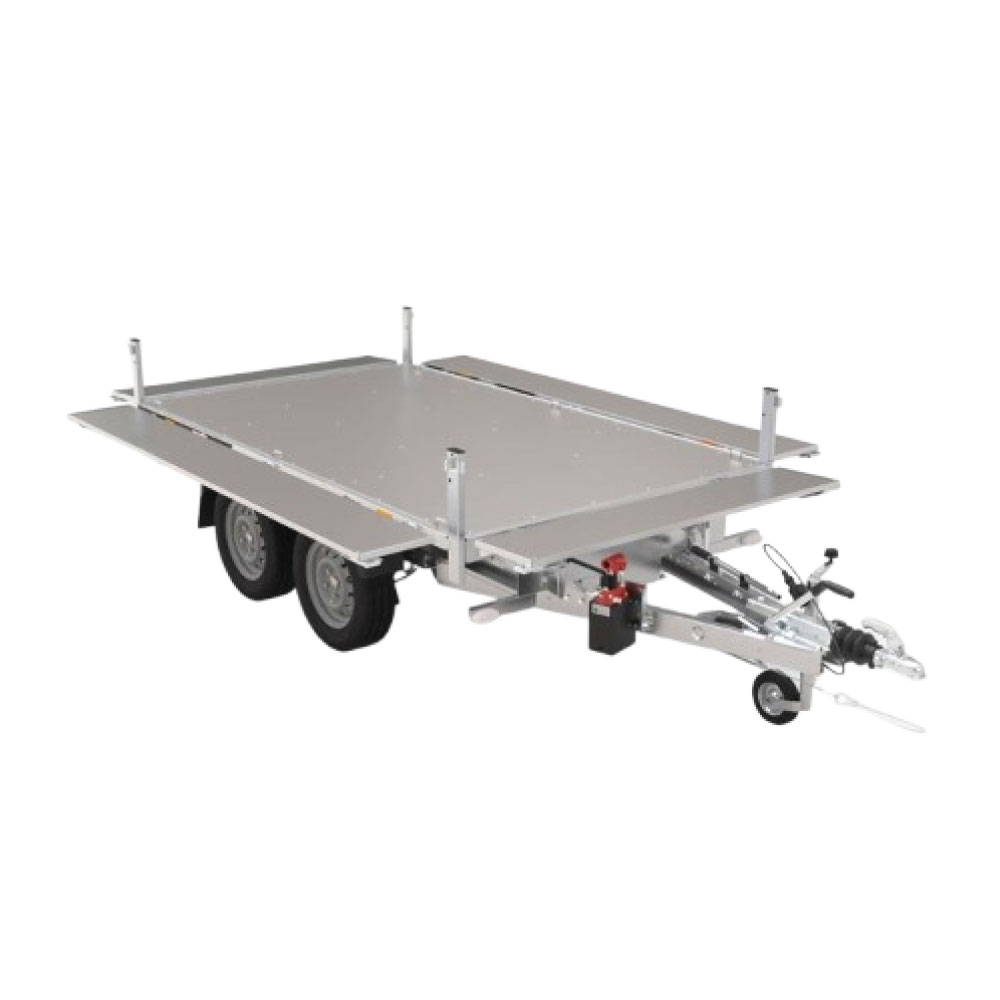 Remorca este echipata cu dublu ax de 1500kg/2000kg si cu sistem de franare. Podeaua remorcii este din otel, cat si obloanele laterale.