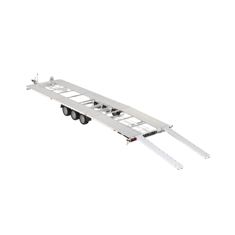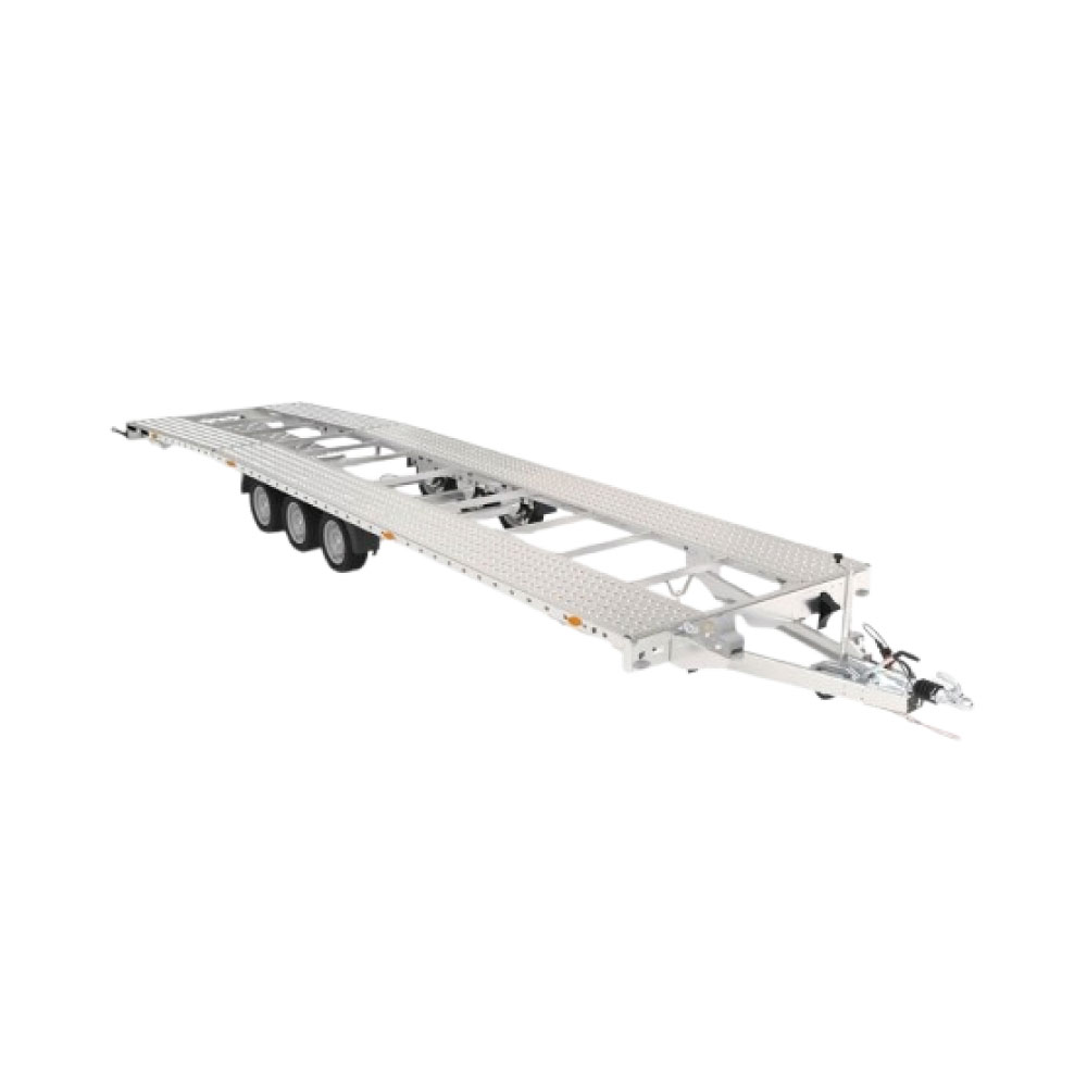 Remorcă pentru transportul automobilelor cu o suprafață de transport înclinata pe spate cu un unghi de urcare îmbunătățit. Remorca este echipată cu un podea de aluminiu, rampe din oțel ascunse sub suprafața de încărcare, un suport pentru troliu cu opțiuni de montare pe ambele părți și numeroase puncte de fixare.